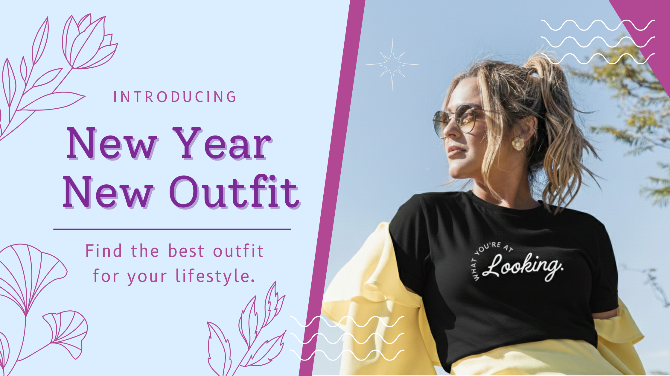 A "New Year New Outfit" collection. The left half is light blue with purple text and line-drawn flowers. The right half shows a woman wearing sunglasses, a black graphic tee that says "What You're Looking At," and a yellow jacket, set against a clear blue sky.